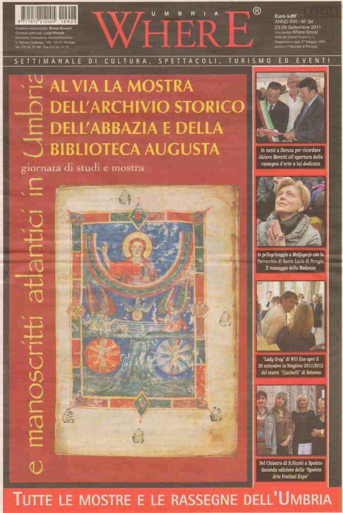 Umbria settegiorni, n. 34, 23-29 settembre 2011, magazine Umbria where, “Mostra manoscritti dell’Archivio storico dell’Abbazia e della biblioteca Augusta”
